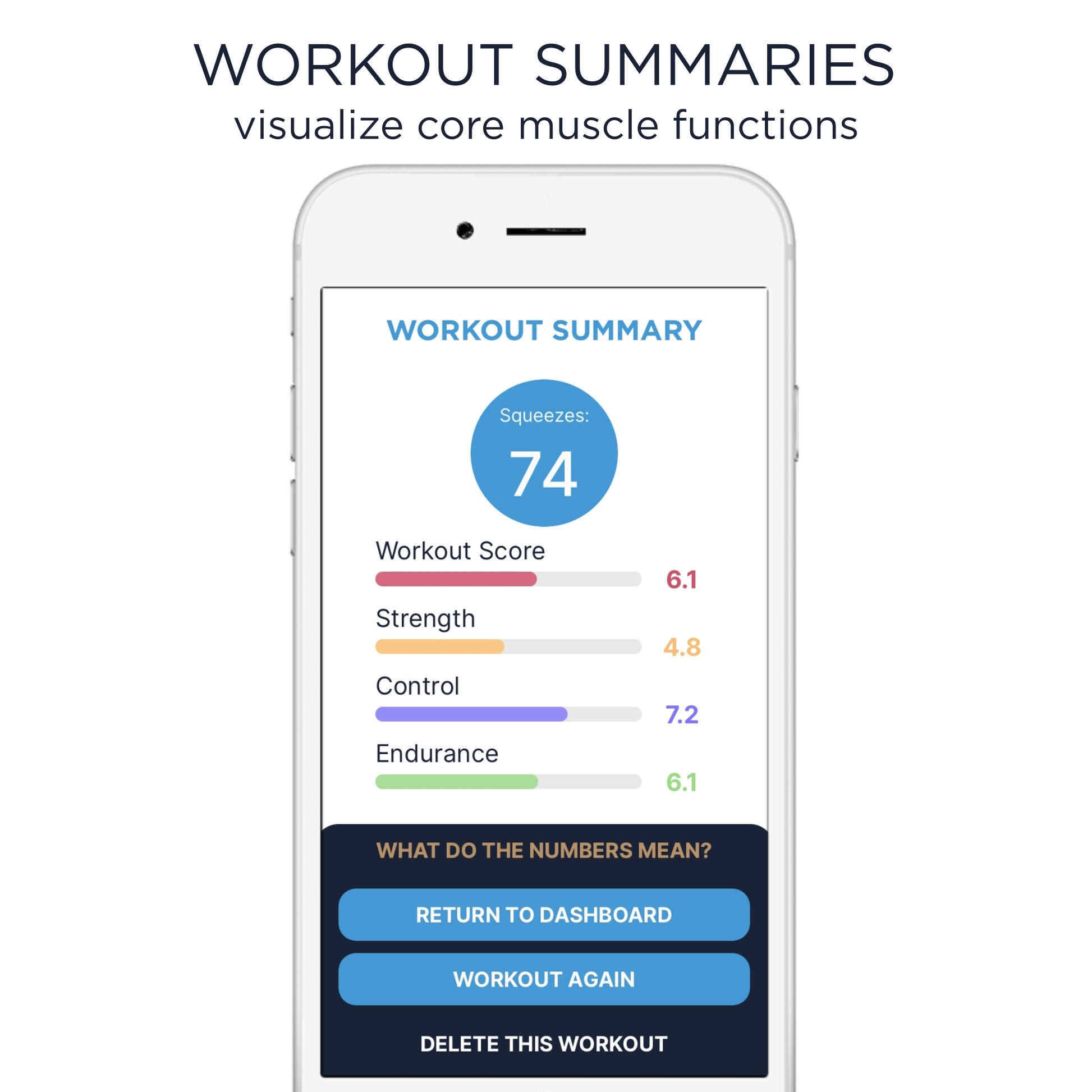 Scores are provided for the overall workout and for specific aspects of muscle function; namely Strength, Endurance, and Control (which includes the ability to relax your pelvic floor muscles).